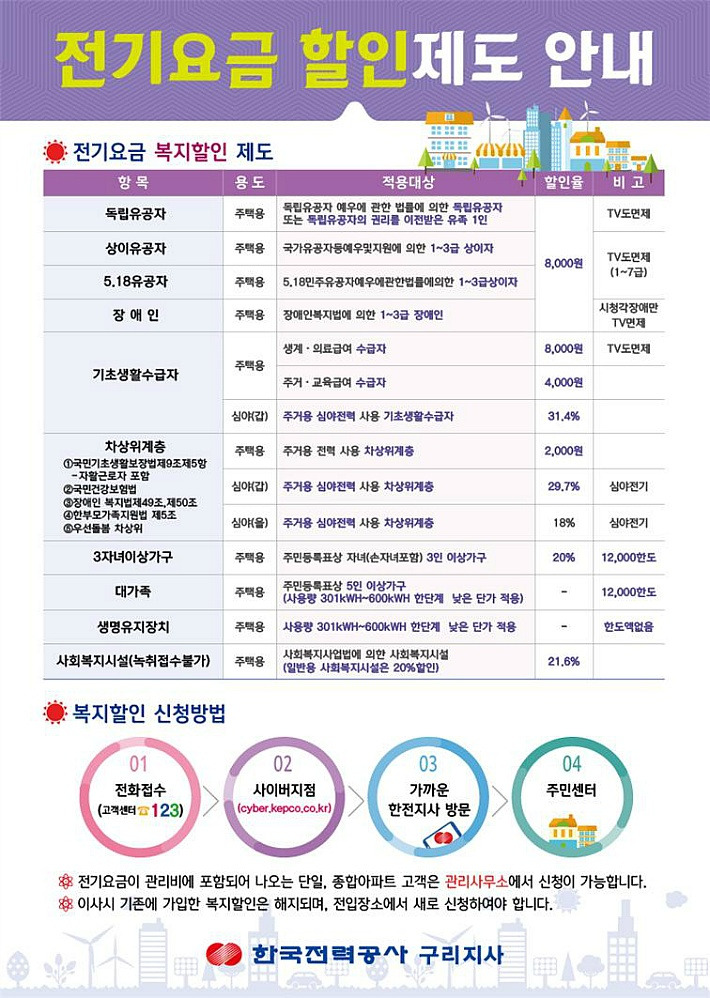 한국전력에서는 다자녀 가구, 저소득층, 복지 대상자 등을 위한 다양한 할인 혜택을 제공하고 있습니다. 한전 고객센터 또는 홈페이지에서 간단히 신청해 월 평균 5~10%의 전기요금을 절약해 보세요.